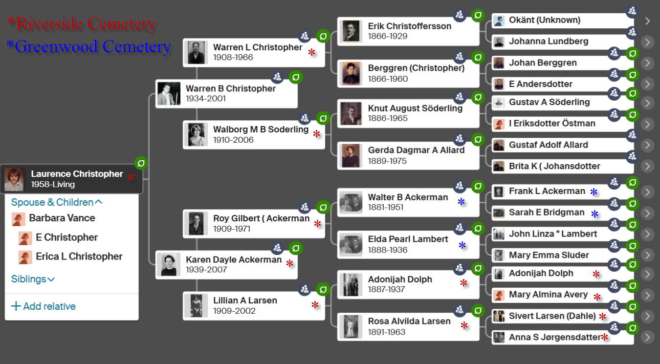 Below is a Family Tree Diagram with designation of local cemeteries (Riverside in Chikaming Township & Greenwood in Bridgman) where our relatives are buried. There is a map of Riverside Cemetery showing the location of all the graves there (click to enlarge)