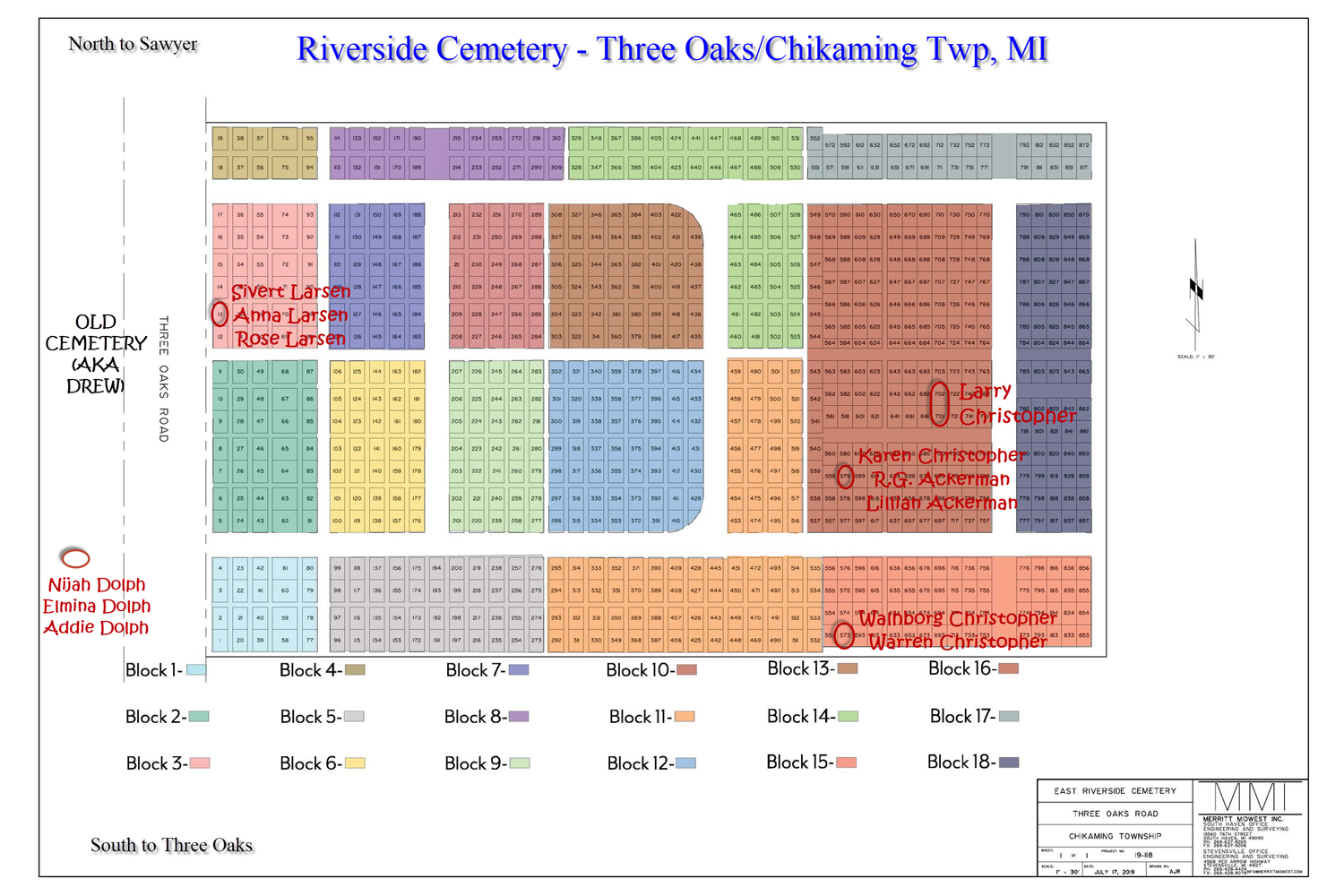 Below is a Family Tree Diagram with designation of local cemeteries (Riverside in Chikaming Township & Greenwood in Bridgman) where our relatives are buried. There is a map of Riverside Cemetery showing the location of all the graves there (click to enlarge)